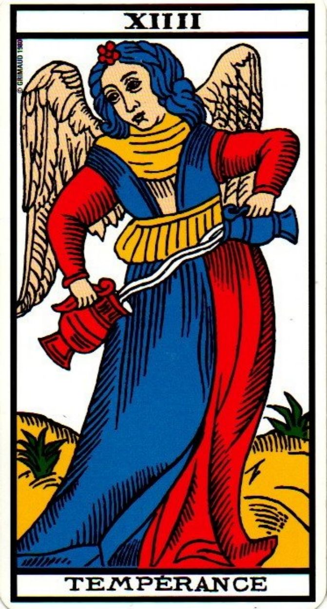 La modération et l'équilibre sont au cœur du message de Tempérance, souvent représentée par un personnage maniant deux forces opposées. Cette carte met en lumière le besoin d'équilibre dans votre vie, avec votre entourage notamment. Tempérance vous apporte aussi le dialogue et la guérison après certains excès.